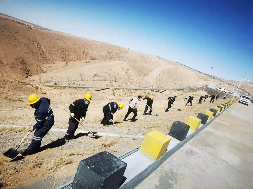 本次活動重點(diǎn)對基礎(chǔ)壩兩側(cè)坡面進(jìn)行綜合治理,治理長度約1.5公里。面對坡陡、風(fēng)大、黃沙亂舞的工作環(huán)境,黨員干部不懼困難、以身作則、俯沖一線,帶頭撿拾垃圾、清理尾砂、覆土灑水以及對安全警示牌進(jìn)行維護(hù)保養(yǎng)。廣大職工緊跟其后,或一字排開,或矩陣展開,忙碌的身影遍布整個(gè)坡面,鏟車的轟鳴聲、鐵锨的吱吱聲與狂風(fēng)的呼嘯聲琴簫合奏,在藍(lán)天、斜陽和荒山的襯托下,勾勒出一幅“聲與色”、“動與靜”相得益彰的勞動生產(chǎn)畫卷。